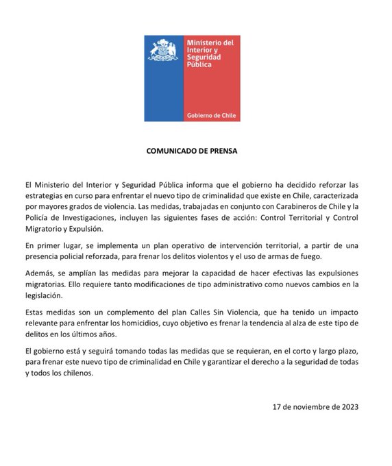 El Gobierno, a través del Ministerio del Interior, anunció medidas de reforzamiento en sus controles territoriales y migratorios y expulsiones para afrontar la crisis de seguridad que vive el país. El ministerio, a través de un comunicado, indicó que decidió “reforzar las estrategias en curso para enfrentar el nuevo tipo de criminalidad que existe en Chile, caracterizada por mayores grados de violencia”.