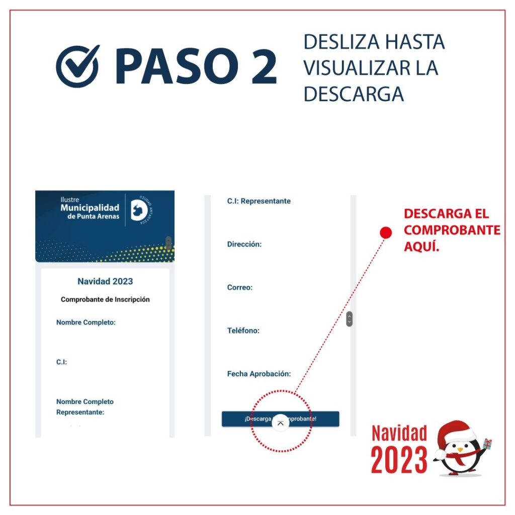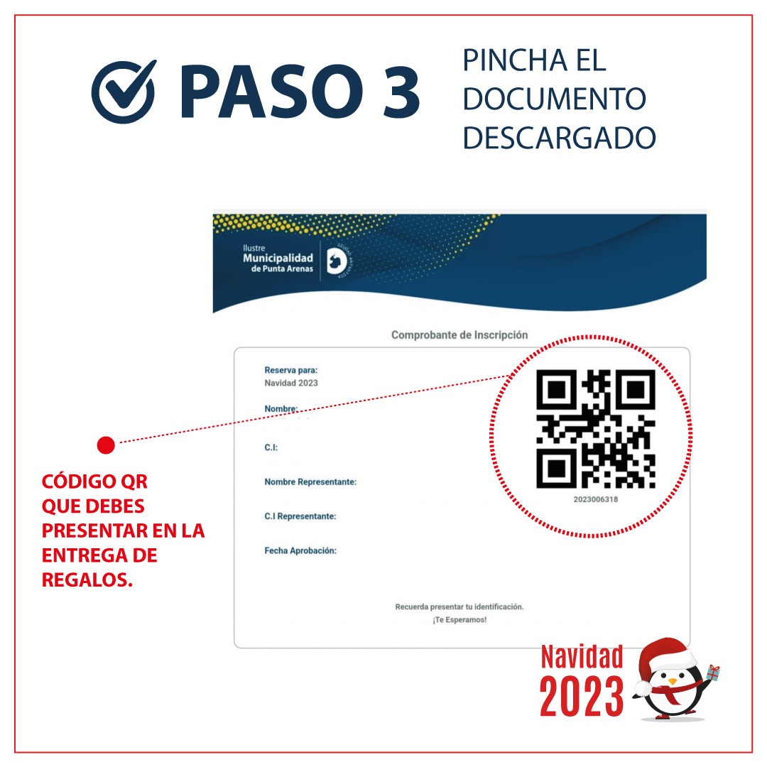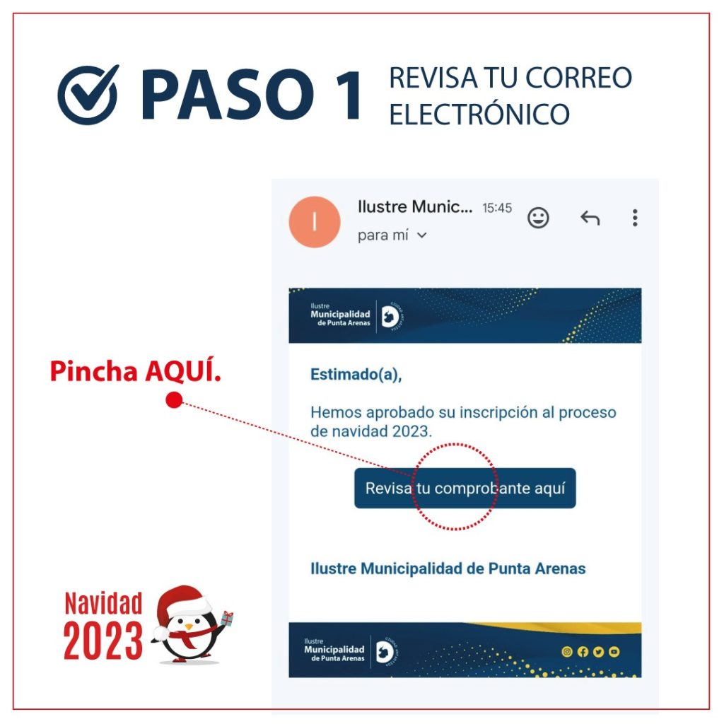 Recuerda que debes llevar el código QR enviado a tu respectivo correo electrónico el día de la inscripción, busca en tu correo «Municipalidad de Punta Arenas» luego haz click en «Revisa tu Comprobante Aquí» y Finalmente «Descarga tu comprobante»