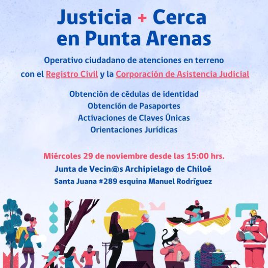 Este miércoles 29 de noviembre, a contar de las 15:00 horas la SEREMI de Justicia y DDHH invita a un nuevo operativo «#Justicia+Cerca», en la junta de vecinos del barrio Archipiélago de Chiloé (Santa Juana N°289 esquina Manuel Rodríguez) de #PuntaArenas con las oficinas móviles de la Corporación de Asistencia Judicial RM y Registro Civil e Identificación, que brindarán diversas prestaciones a la comunidad en materia de asesoría y orientación jurídica gratuita en los ámbitos de familia, civil, penal y #DDHH, obtención de Clave Única, cédulas de identidad y pasaportes, entre otras.