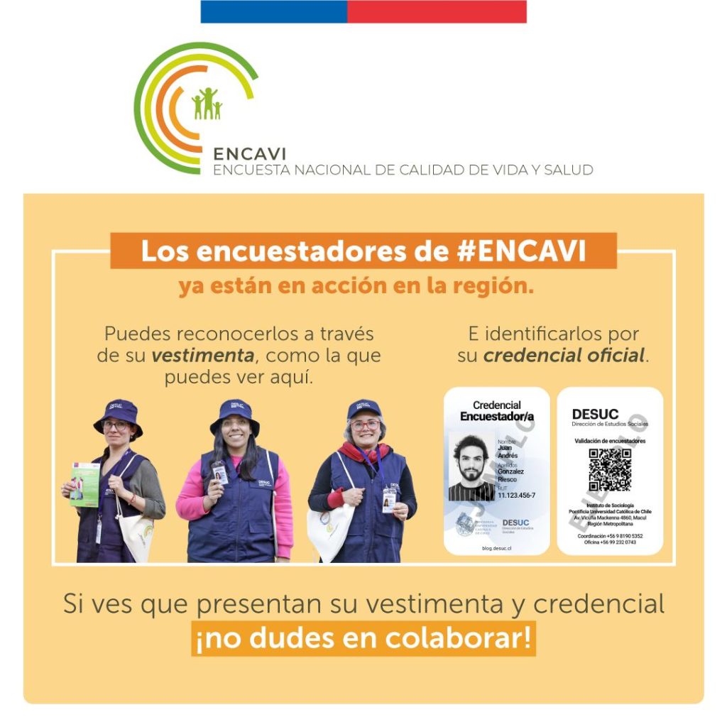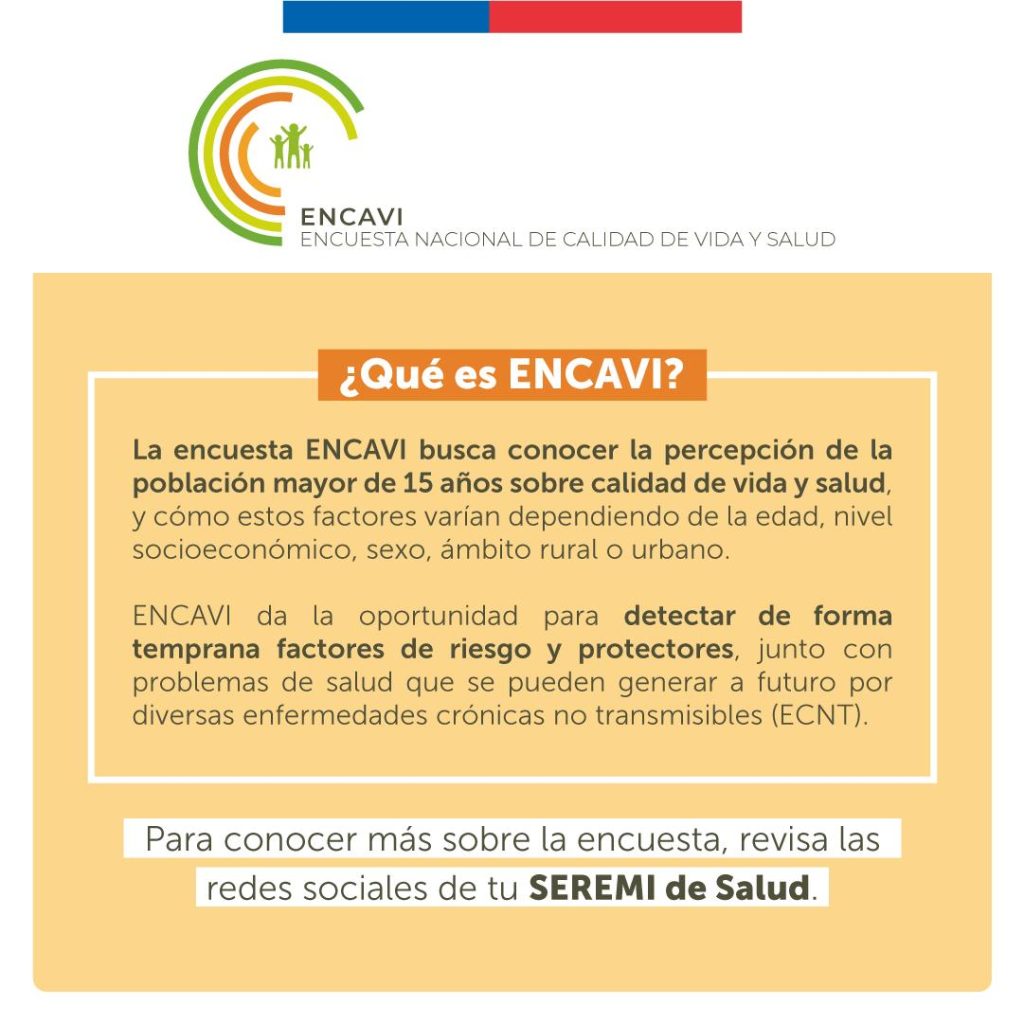 La SEREMI de Salud de la región de Magallanes informa que ya comenzó a realizarse la cuarta versión de la Encuesta Nacional de Calidad de Vida y Salud (ENCAVI), que busca conocer la percepción de la población mayor a 15 años, sobre calidad de vida y salud.