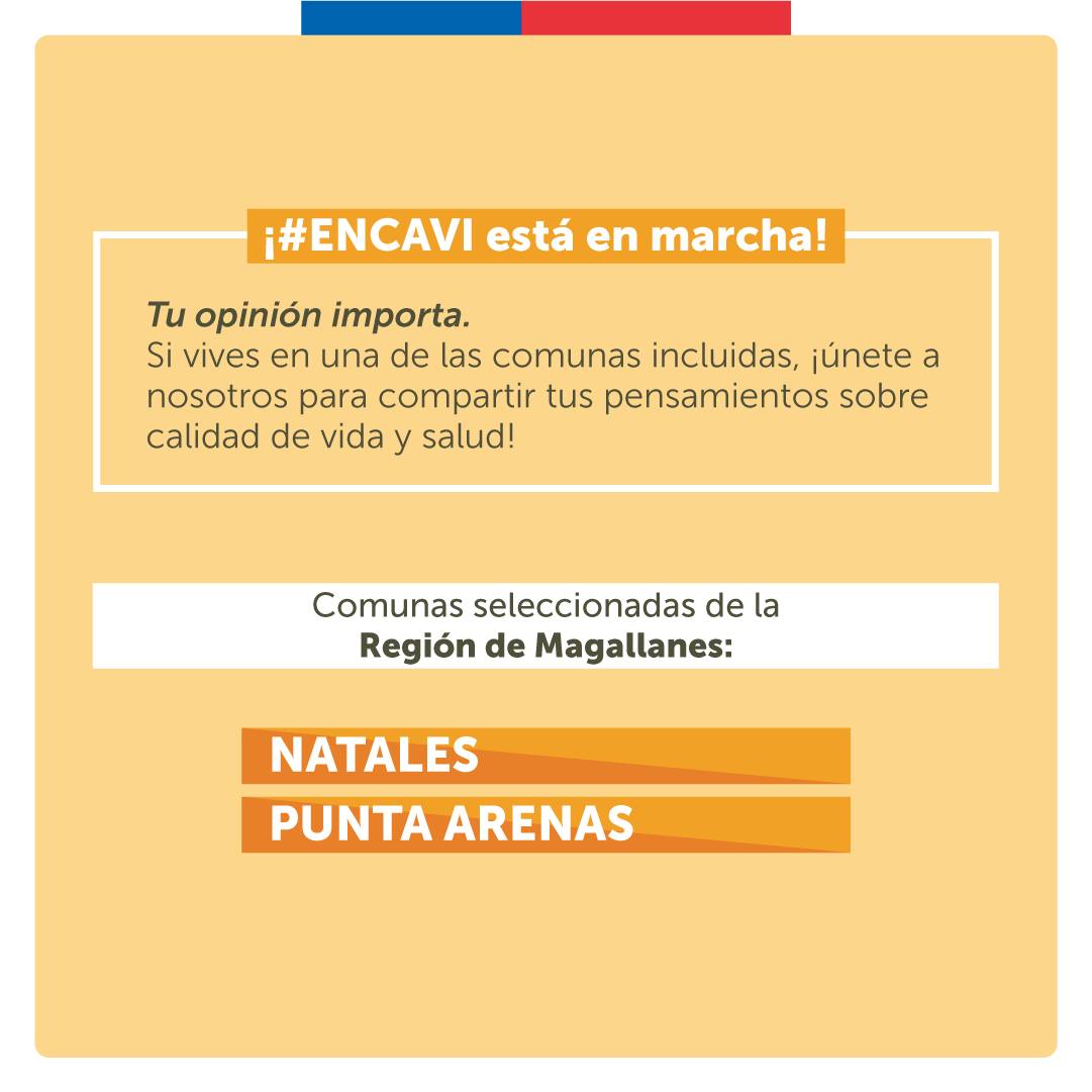 La SEREMI de Salud de la región de Magallanes informa que ya comenzó a realizarse la cuarta versión de la Encuesta Nacional de Calidad de Vida y Salud (ENCAVI), que busca conocer la percepción de la población mayor a 15 años, sobre calidad de vida y salud.