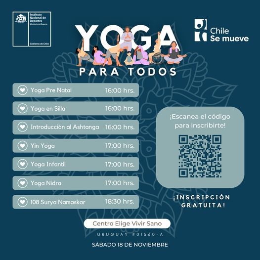 El Ministerio de Deportes MINDEP ha organizado un evento especial de yoga gratuito para todas las edades, una tarde de relajación, estiramiento y bienestar en Centro Elige Vivir Sano el próximo Sábado 18 de noviembre a partir de las 16:00 horas.