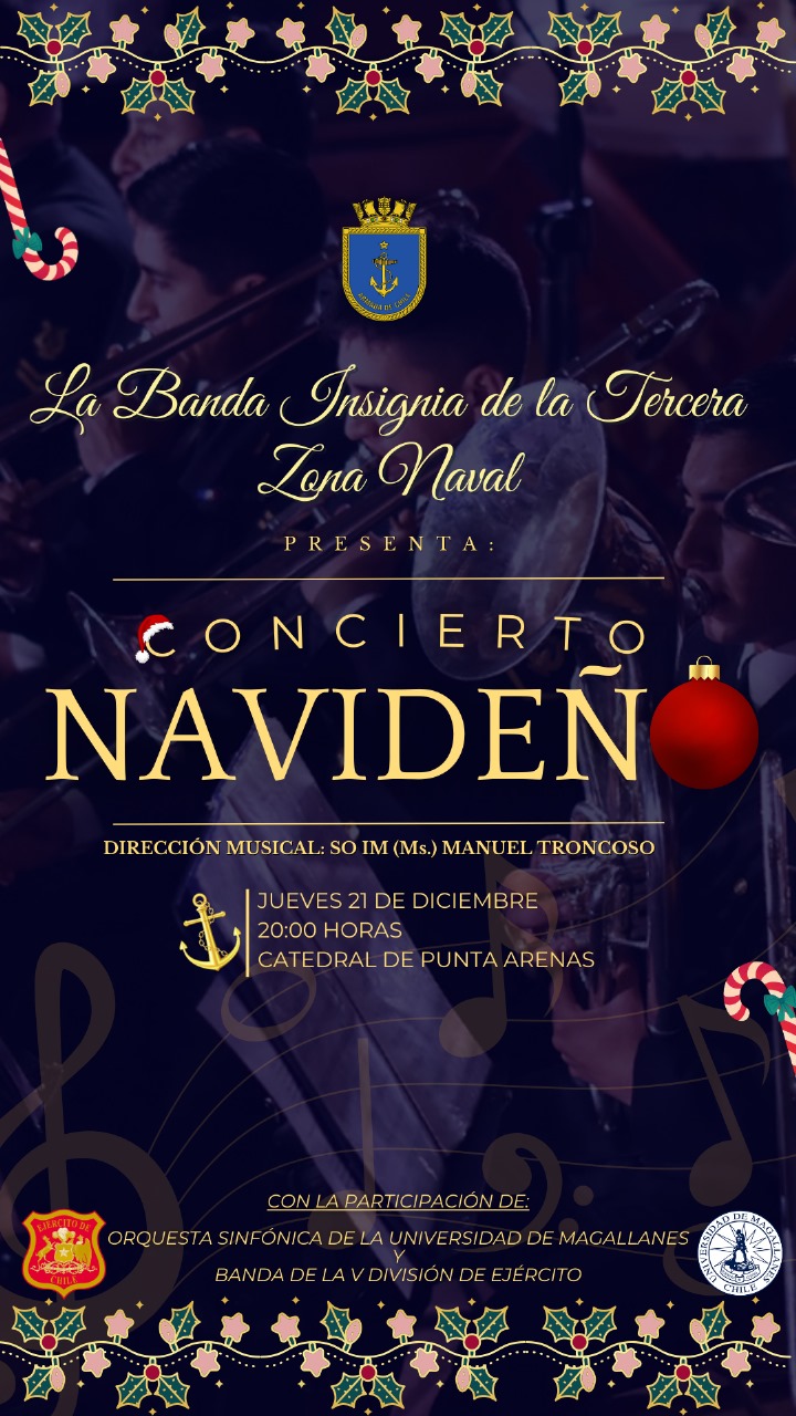 La Banda Insignia de la Tercera Zona Naval invita a toda la comunidad de Magallanes a participar gratuitamente de un concierto de navidad que se realizará este jueves 21 de diciembre a las 20:00 horas en la Catedral de Punta Arenas.