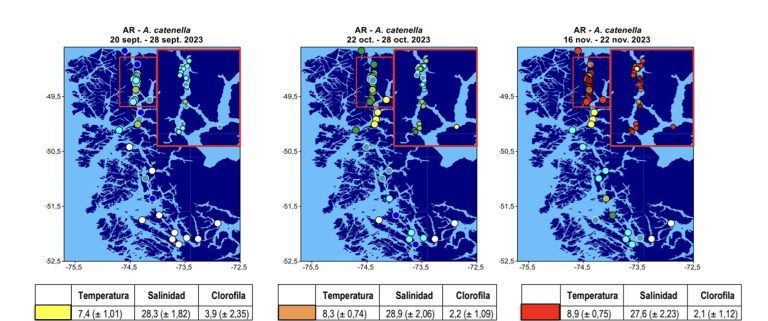 Para el último periodo de muestreo, que fue desde el 16 de noviembre al 22 de noviembre de 2023, los niveles de abundancia relativa (AR) han ido aumentando en la mayoría de las estaciones de monitoreo del sector Norte de Magallanes, presentando valores que van desde 0 (ausente) a nivel 9 (mega abundante). Es importante recalcar la gran cantidad de estaciones de muestreo con valores de AR muy elevados (> a nivel 7).