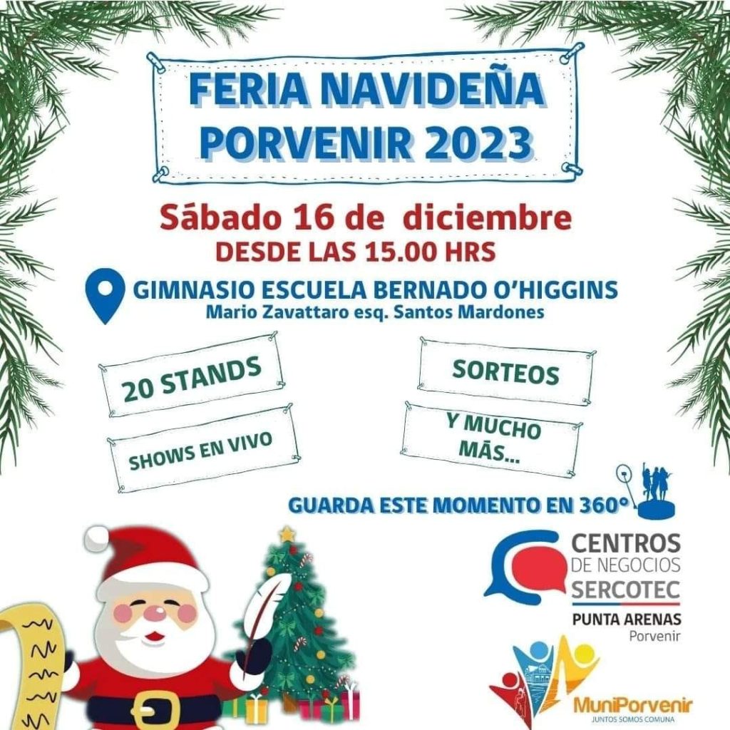 Este sábado 16 de diciembre desde las 15.00 hrs se realizará la Feria Navideña Porvenir 2023, evento organizado entre el Centro de Negocios Sercotec Punta Arenas, satélite Porvenir y la Ilustre Municipalidad de Porvenir.