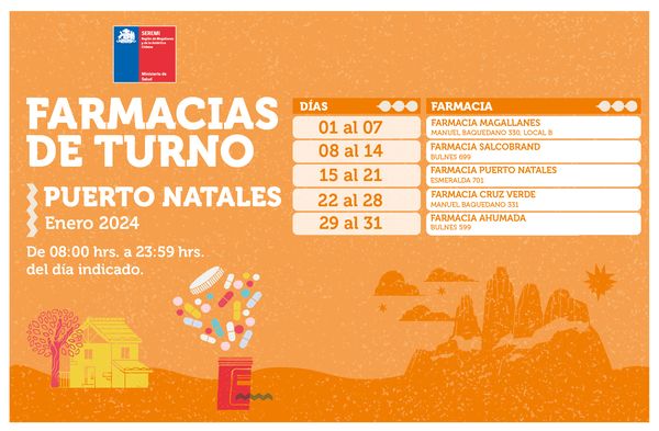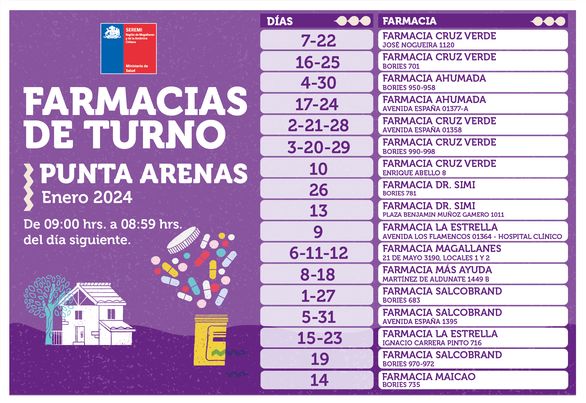Turnos de Farmacias en Punta Arenas y Puerto Natales durante Enero de 2024 Ovejero Noticias 31 de diciembre de 2023 NOTICIAS, PUERTO NATALES, PUNTA ARENAS, SALUD Desde este 1 de enero de 2024 los siguientes serán los turnos de Farmacias en las ciudades de Punta Arenas y Puerto Natales. CompartirTwittearCompartirPin0 Compartir