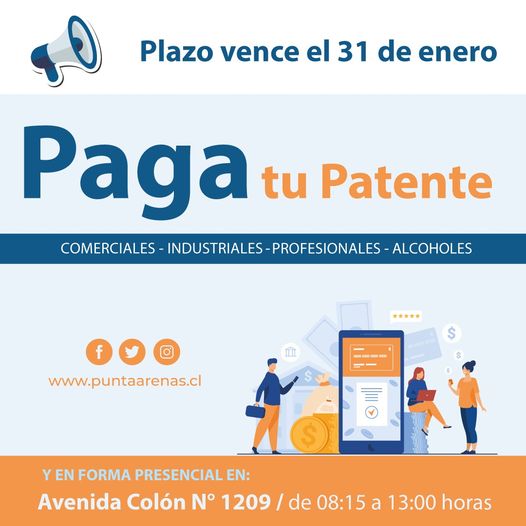La Municipalidad de Punta Arenas informa que hasta el 31 de enero esta disponible el pago de patentes Comerciales, Industriales, Profesionales y de Alcoholes para este primer semestre del año 2024.