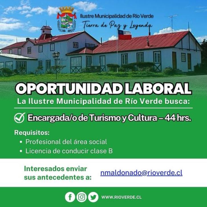 La Municipalidad de Río Verde está buscando un/a Encargado/a de Turismo y Cultura para desempeñarse 44 horas semanales en dicho municipio.