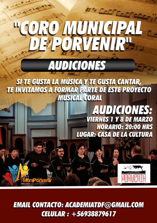 La Municipalidad de Porvenir invita a participar de este proyecto, a todas las personas residentes en Porvenir que les gusta la música y le gusta cantar. La invitación es a formae parte del «Coro Municipal de Porvenir».