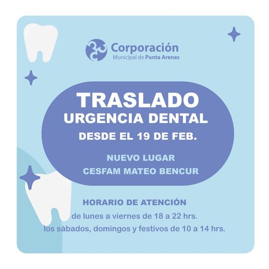 La Municipalidad de Punta Arenas informa que desde este Lunes 19 de Febrero la Urgencia dental se traslada al CESFAM MATEO BENCUR ubicado en Capitán Guillermos N° 0781.