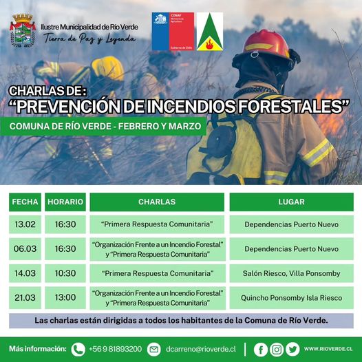 Desde este martes 13 de febrero y en conjunto a @conaf_minagri, la Municipalidad de Río Verde comienza con una serie de charlas preventivas, que buscan preparar a nuestros vecinos y vecinas en caso de emergencias en Río Verde.