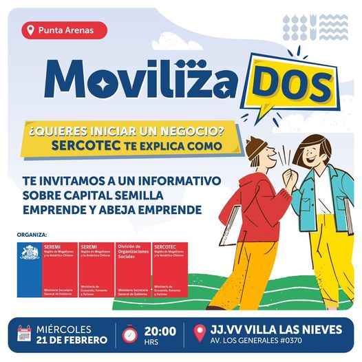 Este miércoles 21 de febrero a las 20:00 hrs, el equipo de MovilizaDOS con SERCOTEC, estarán presentes en la JJ.VV. Villa las Nieves en el sector norte de Punta Arenas, para todas las personas que tengan una idea de negocio y no tengan iniciación de primera categoría en SERCOTEC.