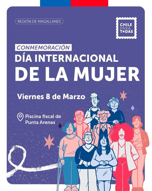 En el marco del Día Internacional de la Mujer, el MINDEP invita a todas las mujeres de la región de Magallanes y de Punta Arenas #Magallanes a conmemorar este día con el evento deportivo «Aqua Zumba» a realizarse el día viernes 08 de marzo de 20:00 a 21:30 hrs. en la Piscina Fiscal de Punta Arenas.