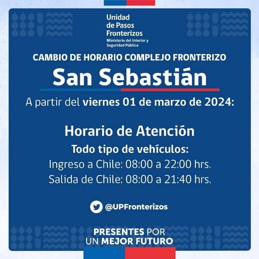 La Delegación Provincial de Tierra del Fuego informó este viernes que desde el 1 de marzo de este 2024 el horario de atención en el Complejo Fronterizo San Sebastián para todo tipo de vehículos será el siguiente:
