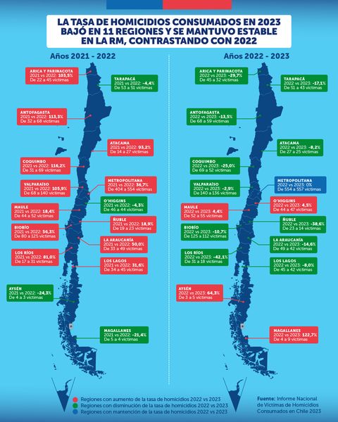 Esto significó que la tasa de homicidios bajara en 11 regiones y se mantuviera estable en la Metropolitana. En contraste con lo ocurrido en 2022, cuando la tasa subió en 12 regiones.