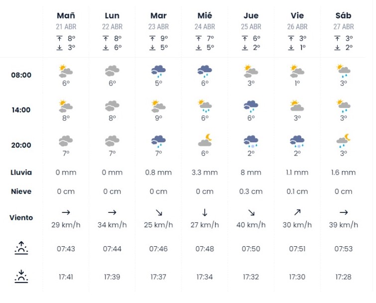 Nublados parciales y vientos débiles en Punta Arenas se pronostican para la semana próxima Ovejero Noticias 20 de abril de 2024 MAGALLANES, NOTICIAS, NOTICIAS DE MAGALLANES, PRONÓSTICO DEL TIEMPO Cielos nublados parciales y vientos moderados hasta 40 kmh y algunas lluvias débiles el miércoles y jueves en Punta Arenas se pronostican para la semana próxima. El siguiente es el pronóstico desde mañana domingo 21 de abril al sábado 27 de abril. CompartirTwittearCompartirPin0 Compartir CRONICACrónica RegionalNoticias de MagallanesPunta Arenas