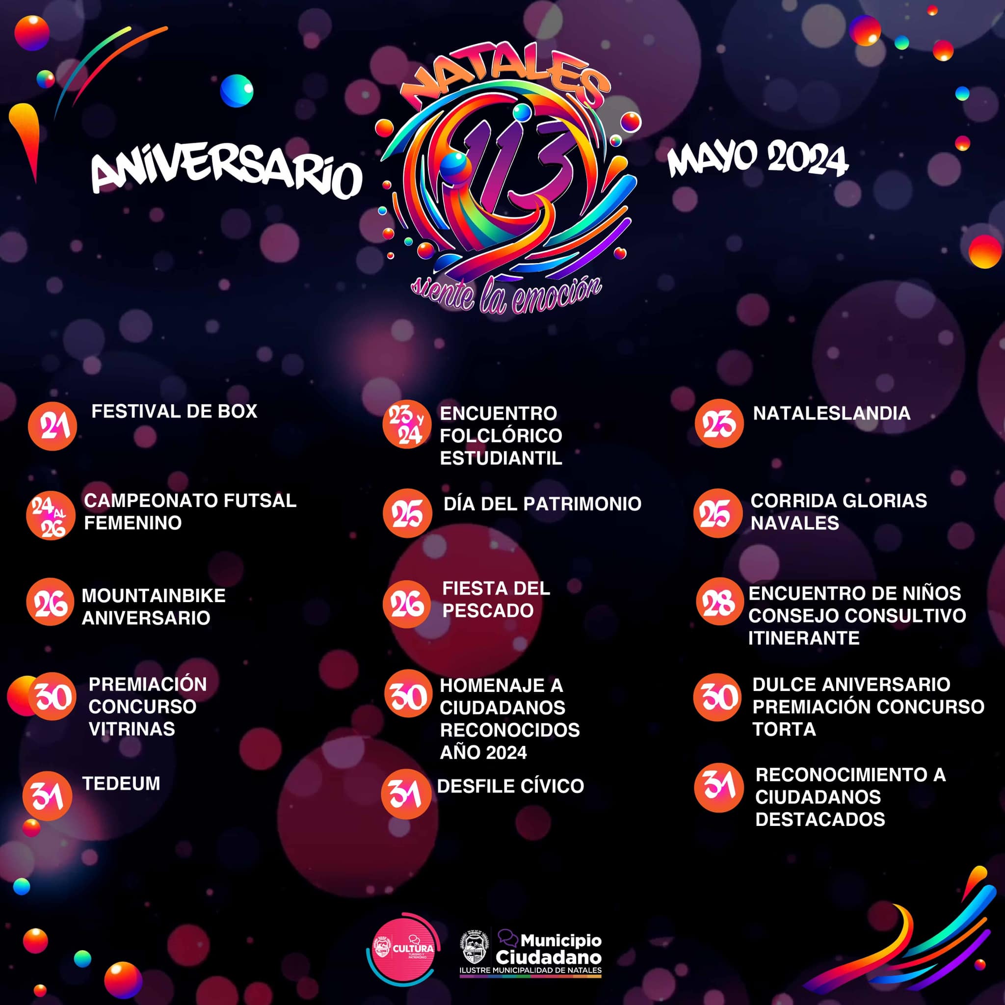 En el salón auditórium del Cormorán de las Rocas se realizó el pasado miércoles 24 de abril el lanzamiento oficial de la parrilla programática del Aniversario 113 de Natales, evento organizado por la Ilustre Municipalidad de Natales y la Corporación de Cultura, Turismo y Patrimonio.
