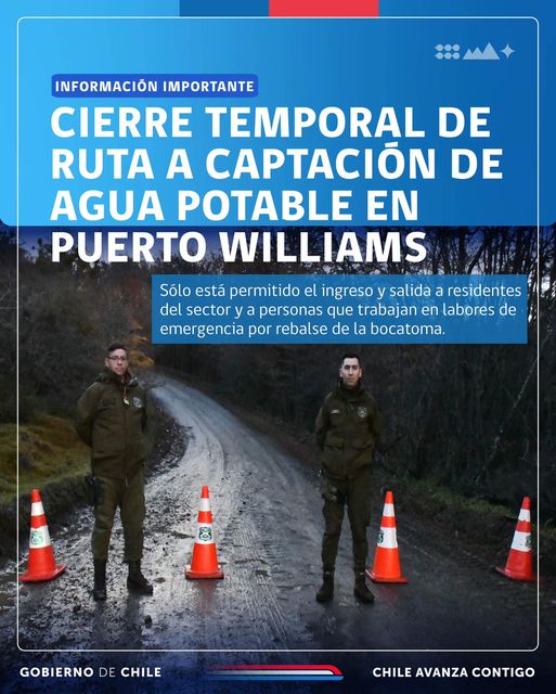 La ruta hacia la captación de agua potable de Puerto Williams se encuentra temporalmente cerrada. Sólo está permitido el ingreso y salida a residentes del sector y a personas que trabajan en labores de emergencia por rebalse de la bocatoma.