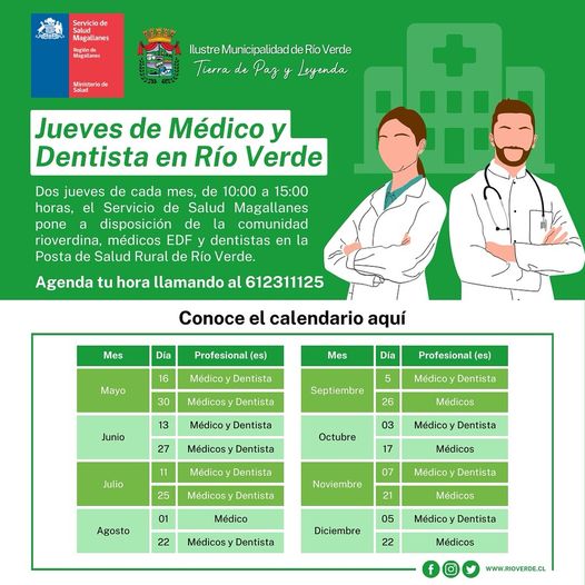 Dos jueves de cada mes, de 10:00 a 15:00 horas, el Servicio de Salud Magallanes, @saludmagallanes pone a disposición de la comunidad rioverdina, médicos EDF y dentistas en nuestra Posta de Salud Rural.
