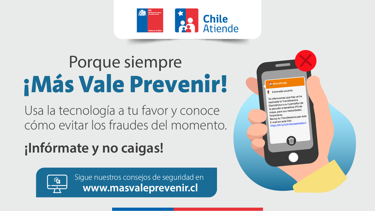 La campaña “Más vale prevenir” es una iniciativa impulsada por ChileAtiende y el Instituto de Previsión Social (IPS), que busca alertar a sus usuarios y usuarias sobre los fraudes del momento, especialmente a través de correos, mensajes de texto (SMS) y llamadas telefónicas.
