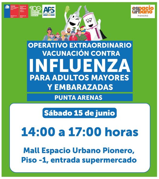 El Servicio de Salud Magallanes realiza un nuevo operativo de vacunación contra la influenza este sábado 15 de junio en Mall Espacio Urbano Pionero de 14.00 a 17.00 horas, para dar una nueva alternativa para realizar este proceso y estar protegidos para el invierno.