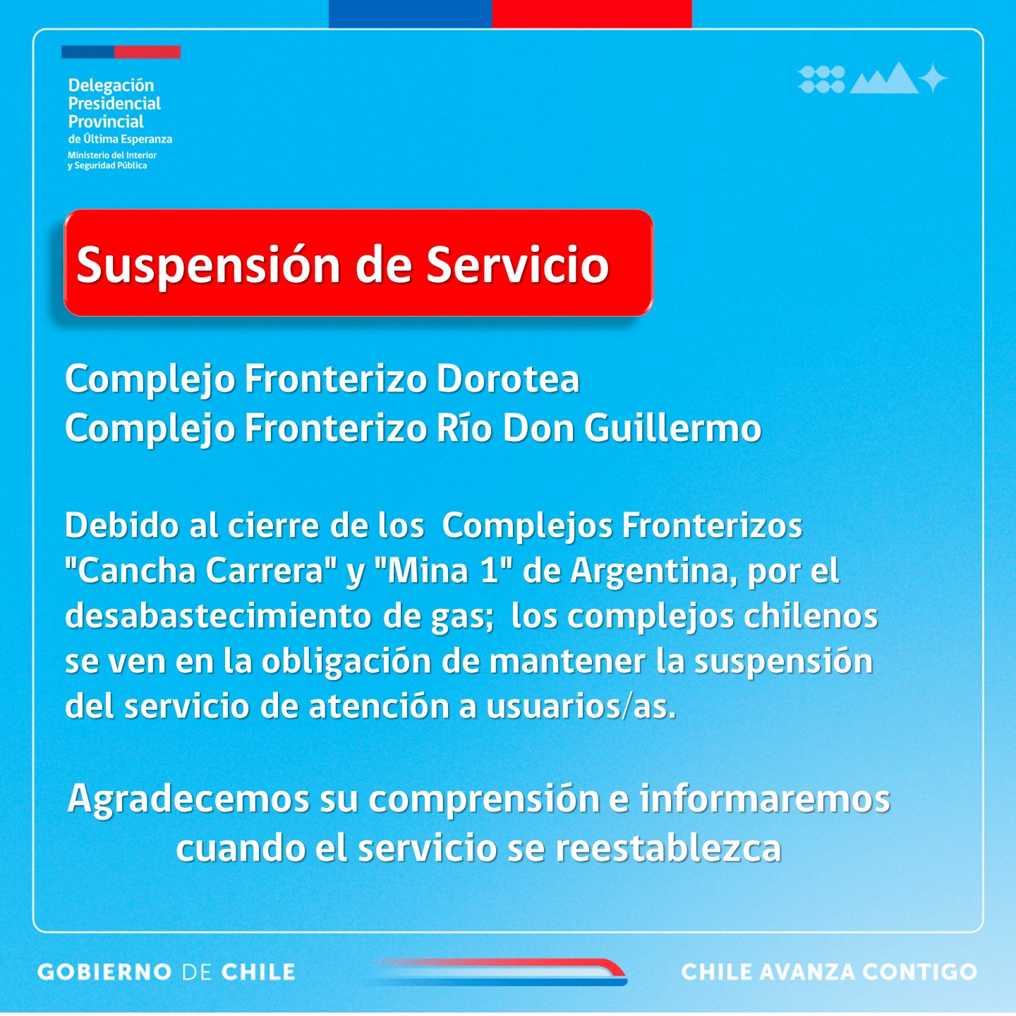 El día de hoy lunes 24 de junio, la Delegación Presidencial Provincial de Ultima Esperanza ha informado que los Pasos Fronterizos Río Don Guillermo y Doroteahan suspendido la atención de público debido al cierre de los Pasos Fronterizos argentinos Cancha Carrera y Mina 1, como consecuencia de la falta de suministro de gas en el sector argentino.
