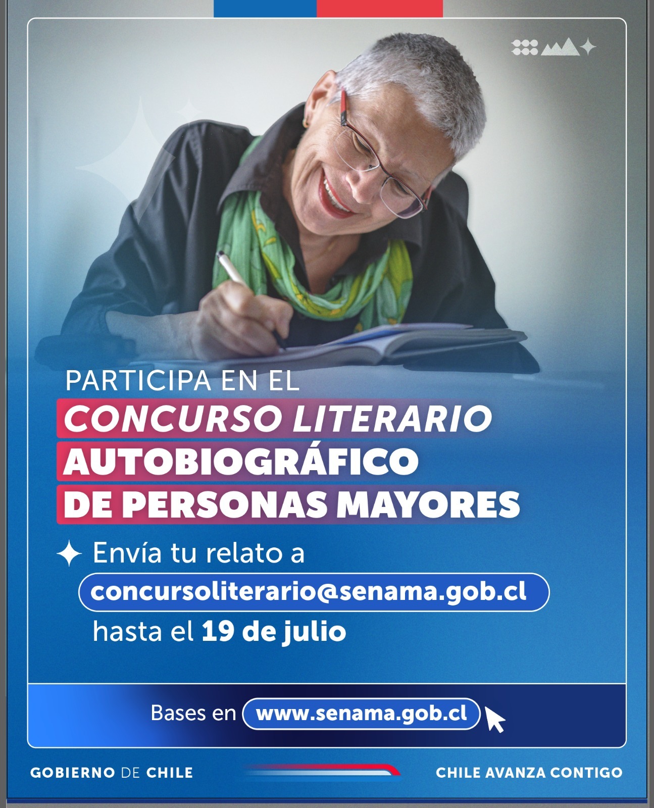 Los relatos se recibirán hasta el 19 de julio a través del correo concursoliterario@senama.gob.cl. Las bases del concurso se encuentran disponibles en la página web www.senama.gob.cl