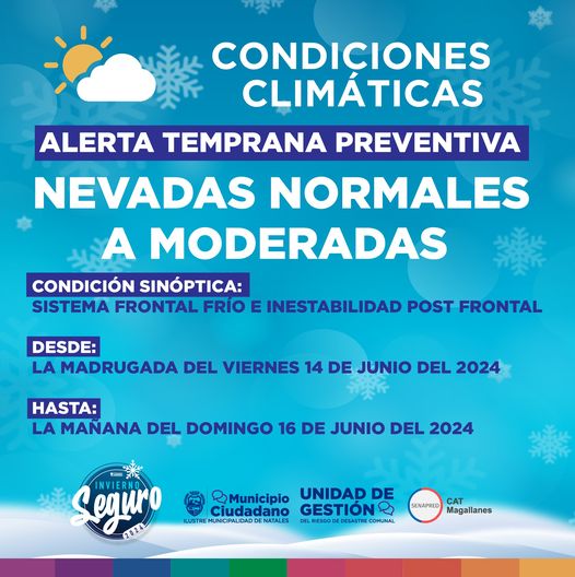En consideración a los antecedentes meteorológicos y a la existencia de factores propicios para la ocurrencia de eventos como acumulación de nieve y baja visibilidad, tanto en calles, caminos urbanos y rurales, en veredas, en equipamiento eléctrico, tendido eléctrico y similares, incluyendo techumbres y estructuras en construcción. Además de interrupción de conectividad terrestre, interrupción de suministros básicos, afectación a sistemas de telecomunicaciones; esta Dirección Regional del SENAPRED, Declara Alerta Verde Temprana Preventiva por Nevadas para la Provincia de Última Esperanza de la Región de Magallanes y de la Antártica Chilena, a contar de hoy jueves 13 de junio de 2024 y hasta que las condiciones meteorológicas así lo ameriten.