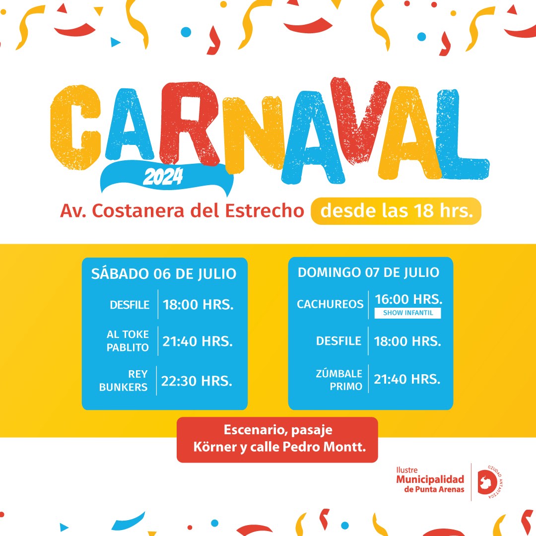 En la Costanera del Estrecho de Punta Arenas se realizará el Carnaval de Invierno este sábado 6 y domingo 7 de julio, teniendo como escenario principal instalado a la altura de Pasaje Koerner y Pedro Montt, evento organizado por la Municipalidad de esta ciudad.