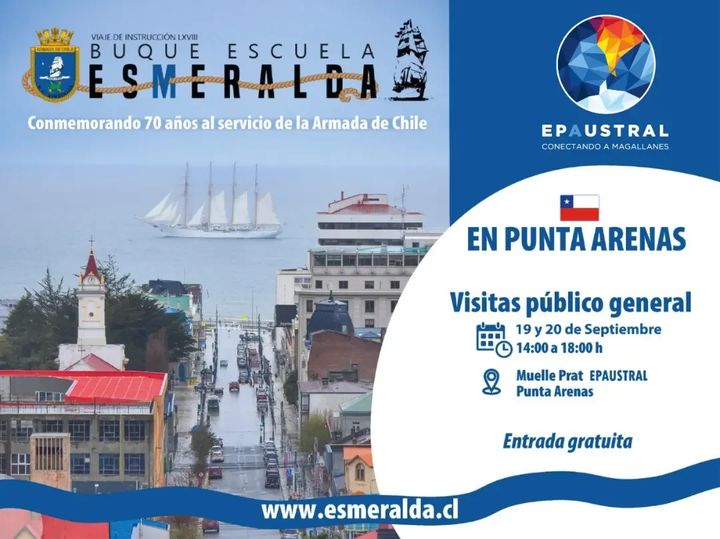 El buque Escuela «Esmeralda» de la Armada de Chile llegó a las costas de Punta Arenas y junto a la Tercera Zona Naval y la empresa EPAUSTRAL invitan a la comunidad a visitar esta emblemática nave en el Terminal Arturo Prat durante estas Fiestas Patrias.