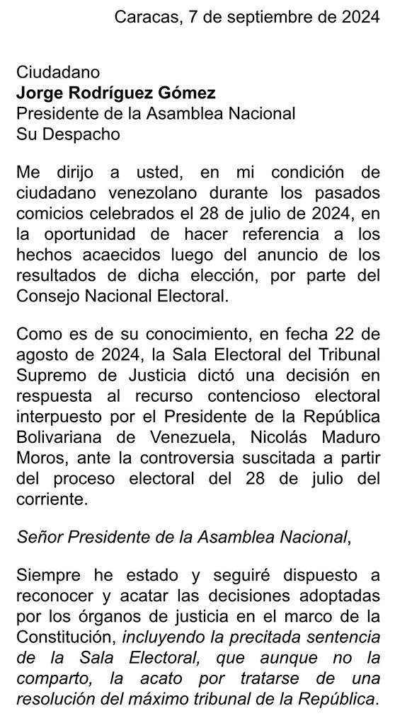 En la misiva, el opositor venezolano reconoció que el Consejo Nacional Electoral emitió un resultado electoral en la noche del 28 de julio pasado. Además, reconoció la autoridad del Tribunal Supremo de Justicia y la sentencia que valida la victoria del presidente Nicolás Maduro en las elecciones del 28 de junio.