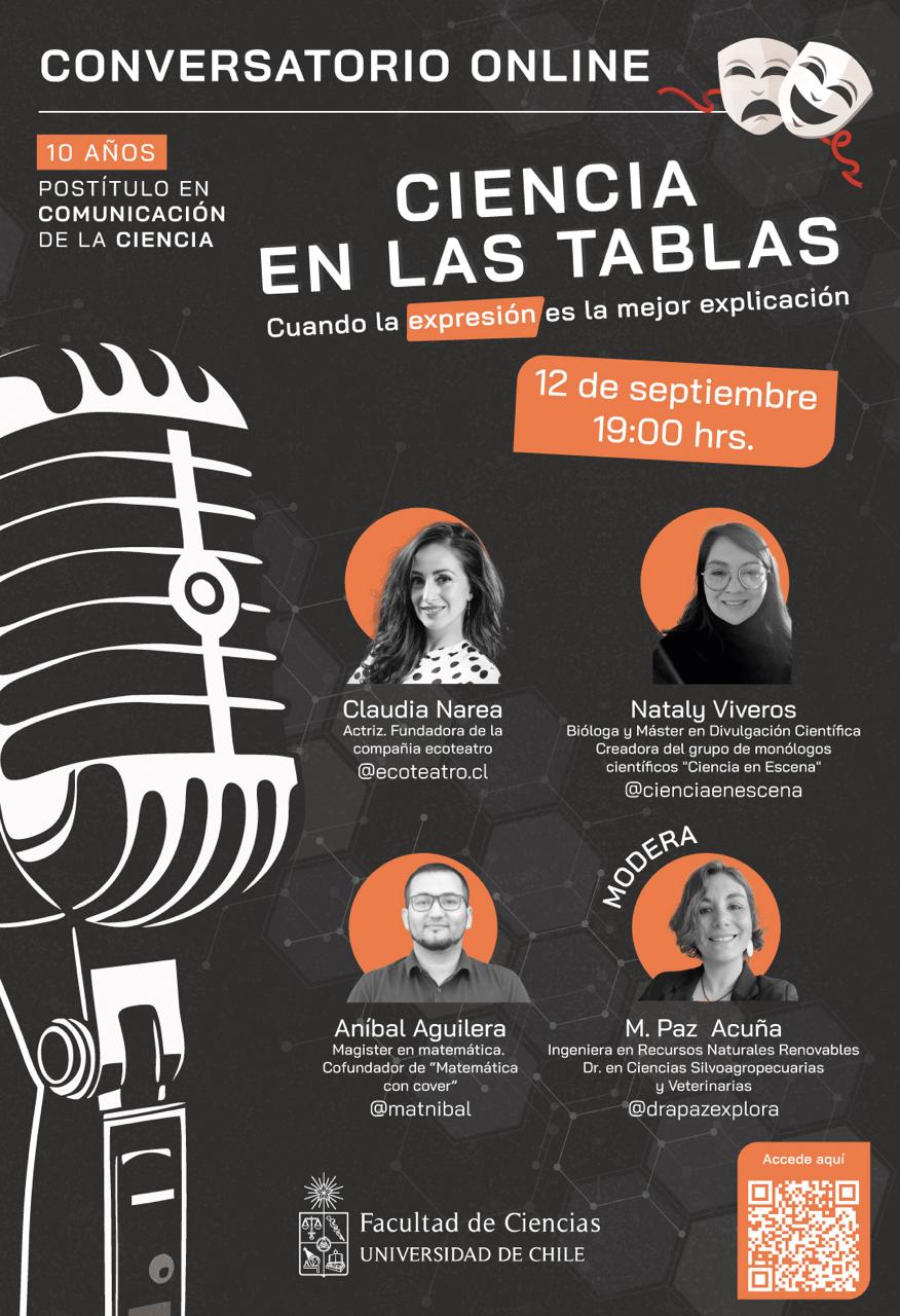 “Ciencia en las tablas: cuando la expresión es la mejor explicación” se denomina el conversatorio online que los y las estudiantes del Postítulo en Comunicación de la Ciencia de la Facultad de Ciencias de la Universidad de Chile se encuentran organizando con destacadas y destacados expositores.