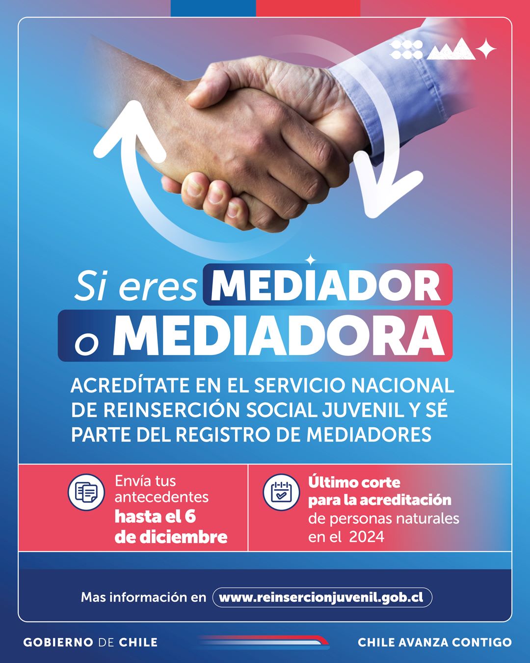Hasta el viernes 6 de diciembre (a las 23:59 horas) se mantendrá abierta la convocatoria 2024 para acreditar a personas naturales que quieran colaborar, ejecutando el programa de Mediación Penal Juvenil y el componente de mediación del programa Servicios en Beneficio a la Comunidad y Reparación del Daño.