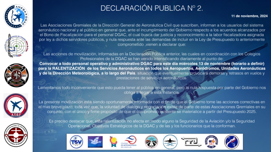 “De acuerdo a lo anunciado por la Asociaciones Gremiales de la DGAC, los aeropuertos y aeródromos del país, retornan a la normalidad mientras siguen avanzando las gestiones en búsqueda de una pronta solución”, manifestaron los funcionarios de la DGAC tras una movilización realizada ayer miércoles 13 de noviembre.