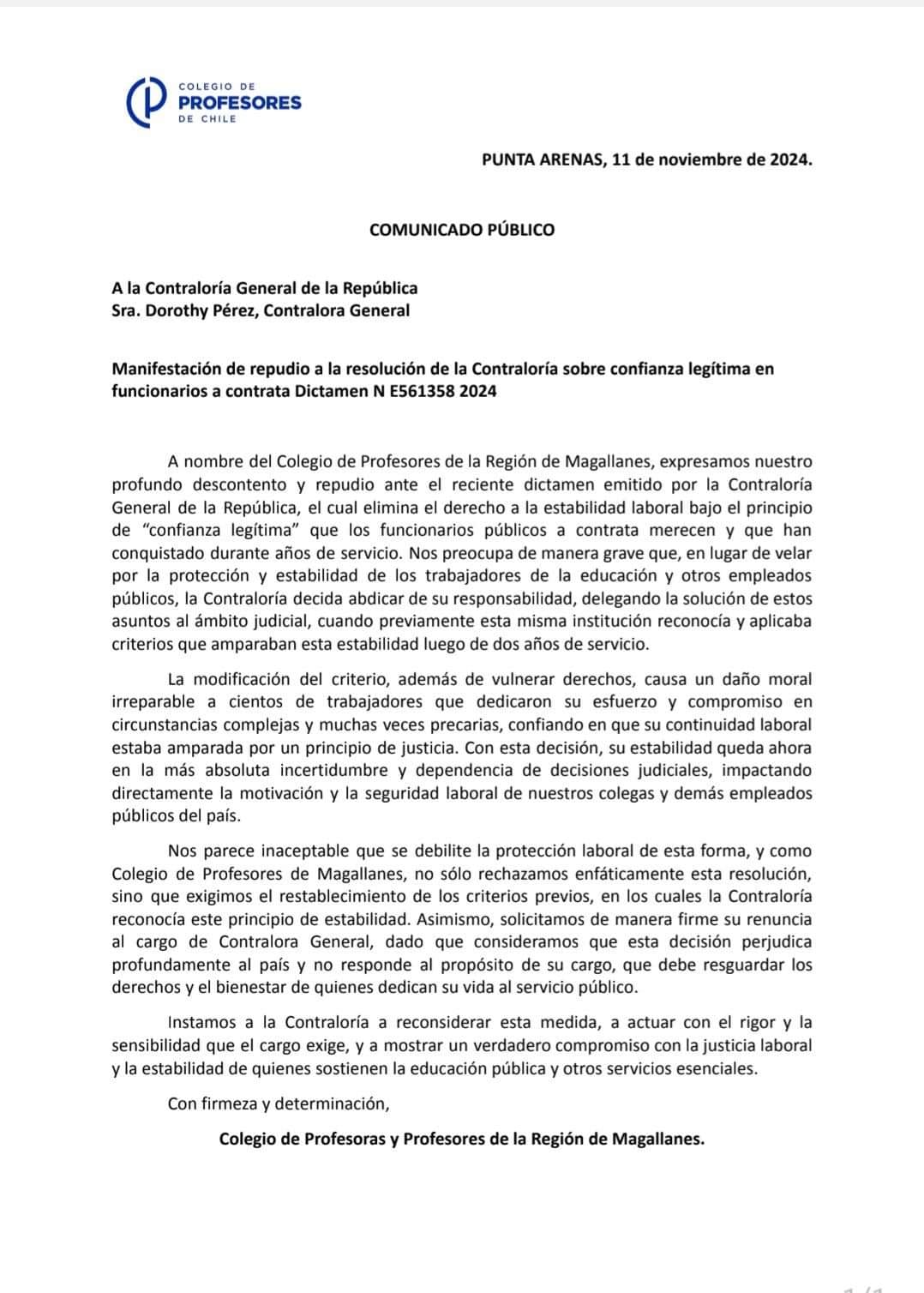 La declaración del Colegio de Profesores de Magallanes es la siguiente: