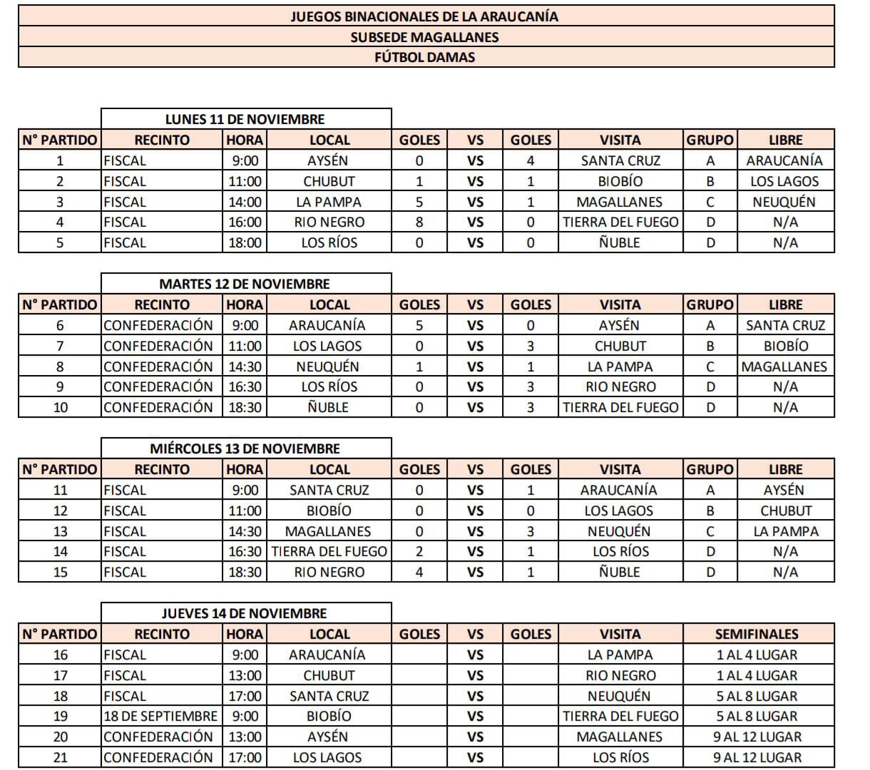 Las ciudades sedes del torneo son Coyhaique y Puerto Aysén, además de Punta Arenas de la región de Magallanes. Entre el 11 y 15 de noviembre se disputarán siete disciplinas deportivas: atletismo, básquetbol, judo, natación y vóleibol en la región de Aysén; y ciclismo y fútbol en la región de Magallanes.