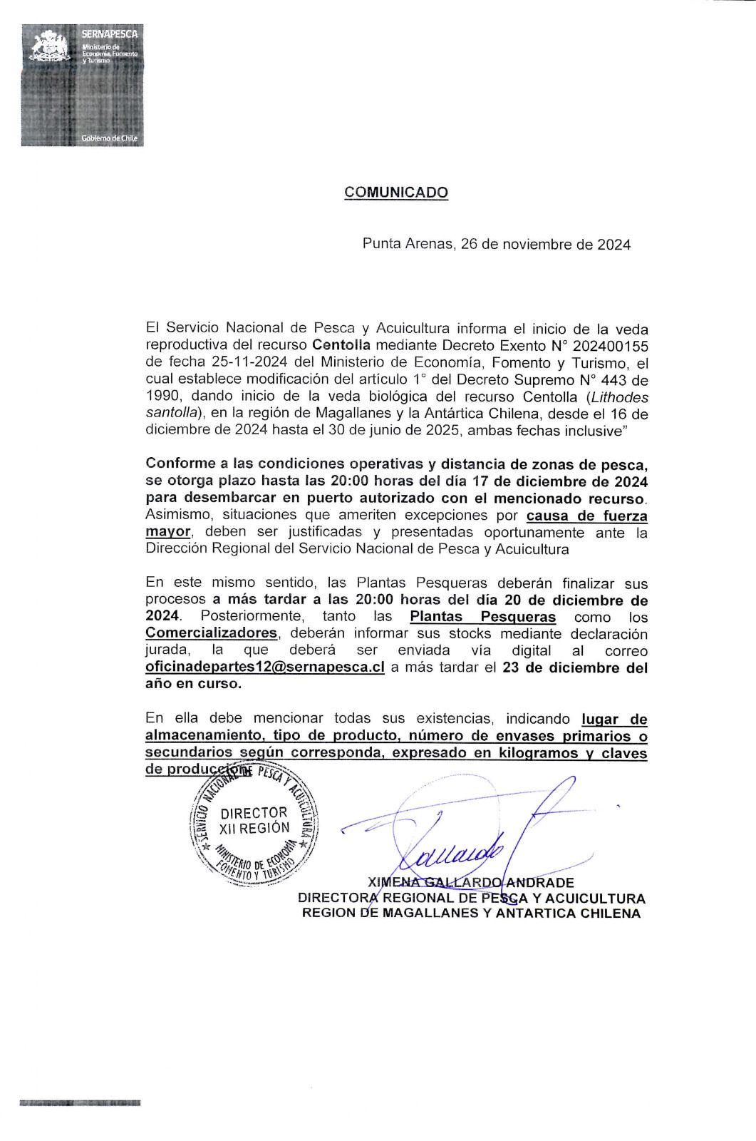 La veda biológica comienza desde el lunes 16 de diciembre de 2024 hasta el 30 de junio de 2025, fechas inclusive. Para la extracción de centolla, Sernapesca recomienda utilizar trampas centolleras, ya que las redes son un arte de pesca ilegal que daña el recurso. Las redes no permiten discriminar las especies que se capturan, ni las que están bajo talla o hembras.