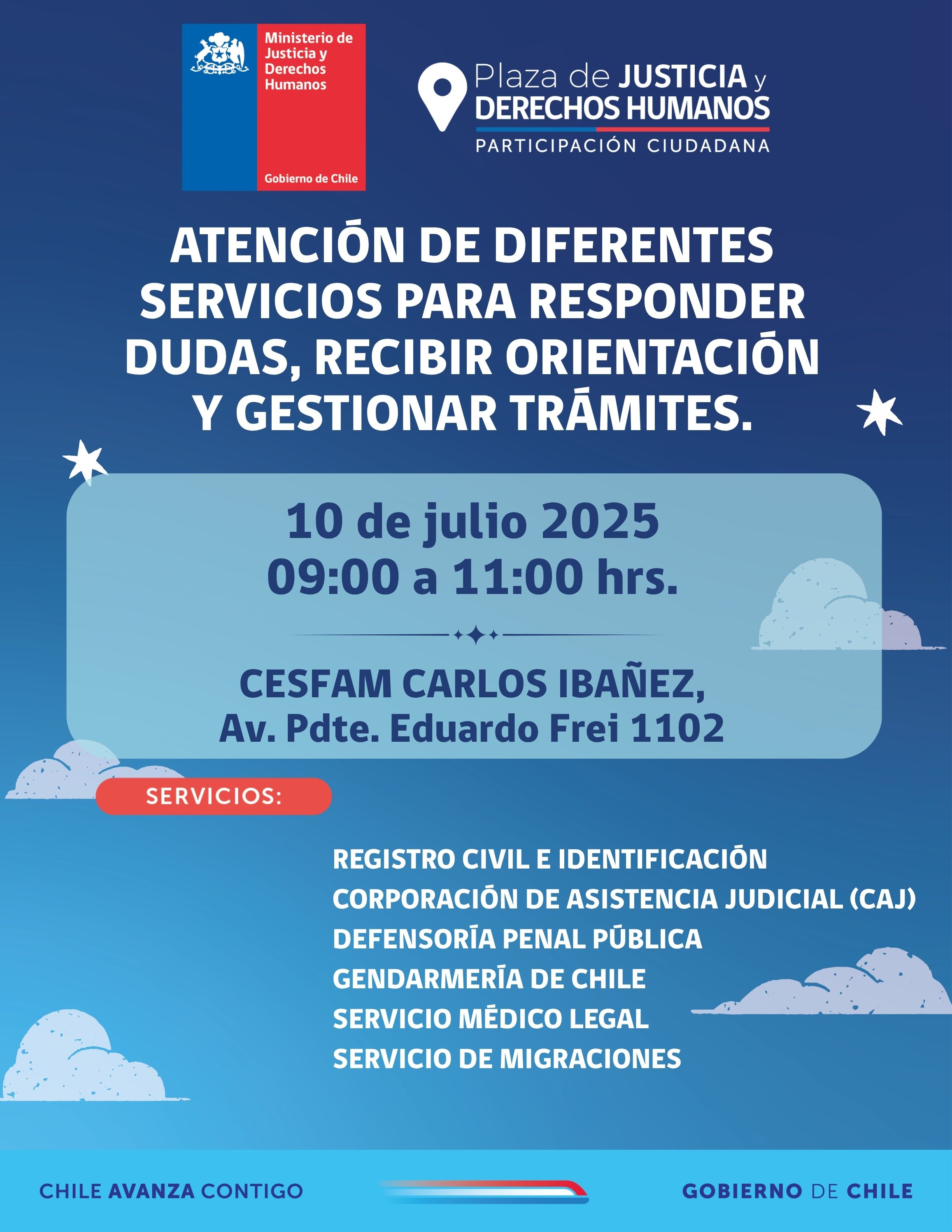 Un nuevo operativo a cargo de los servicios del sector Justicia tendrá lugar este jueves 10 de julio, de 09:00 a 11:00 horas en dependencias del Centro de Salud Familiar Carlos Ibáñez (Avda. Eduardo Frei N°1102), el cual se traducirá en la novena “Plaza de Justicia y Derechos Humanos” del presente año.
