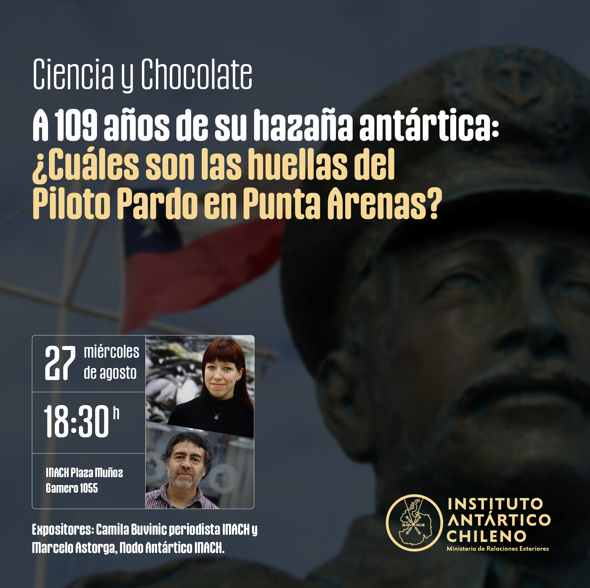 La charla titulada “ A 109 años de su hazaña antártica: ¿cuáles son las huellas del Piloto Pardo en Punta Arenas?” Será presentación por la periodista del INACH Camila Buvinic junto a Marcelo Astorga, sociólogo del proyecto Nodo Laboratorio Natural Antártico.
