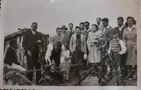 FOTO 4 Asado en Rinconada Bulnes para celebrar el bautizo de los Coliboro Pérez, 30 de diciembre de 1945. De izquierda a derecha, entre otros: barba (tío) Jure Martinic, Marcos Mladinic, Antonio Mladinic, Sánchez Pareja y señora, Elena Beros de Mladinic, Reinerio García y su señora María, Manuel Sánchez, Frana Cvitanic y José Prieto Sánchez.
