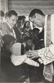 FOTO 6 En la capilla de Fuerte Bulnes el padre Martín Marosa bautiza a Belisario Coliboro, en brazos de su madre Elena. Están presentes Marcos Mladinic, la señora de J. Uyevic, Antonia Giner de Sánchez junto a Humberto, Pedro y Pablo Coliboro.