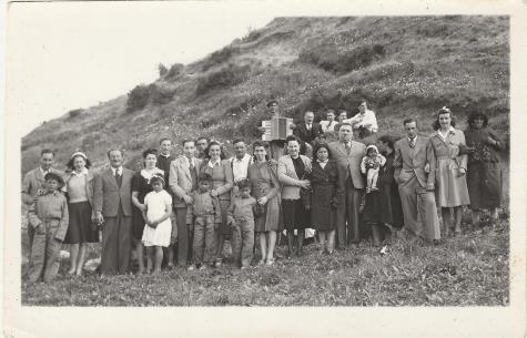 FOTO 2 Rinconada Bulnes, domingo 30 de diciembre de 1945. Los padrinos y madrinas de los Coliboro Pérez posan junto a los festejados: Jesús Sánchez y Antonia Giner con Pedro, J. Uyevic y señora con Miguelina, el padre Marosa, Manuel Sánchez y Dinka Cvitanic con Humberto, Oliverio Prieto y Carmen Sánchez con Pablo, Elena Beros, Dominga y Nicolás Mladinic, Elena Pérez con Belisario, Marcos Mladinic, Frana Cvitanic y la abuela Teresa. Al lado del acordeonista se observa, entre otros, al barba (tío) Jure Martinic.