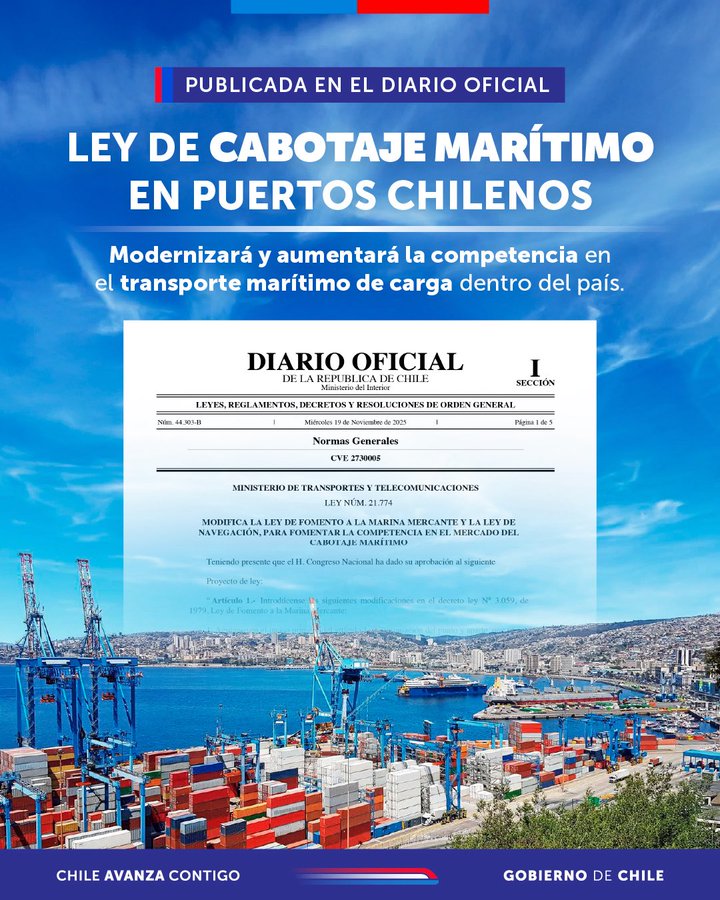Tras 13 años de discusión, el Congreso Nacional aprobó de forma transversal la nueva Ley de Cabotaje Marítimo, una legislación destinada a modernizar y fortalecer el transporte marítimo de carga dentro de Chile. Hoy miércoles 19 de noviembre entró en vigencia.